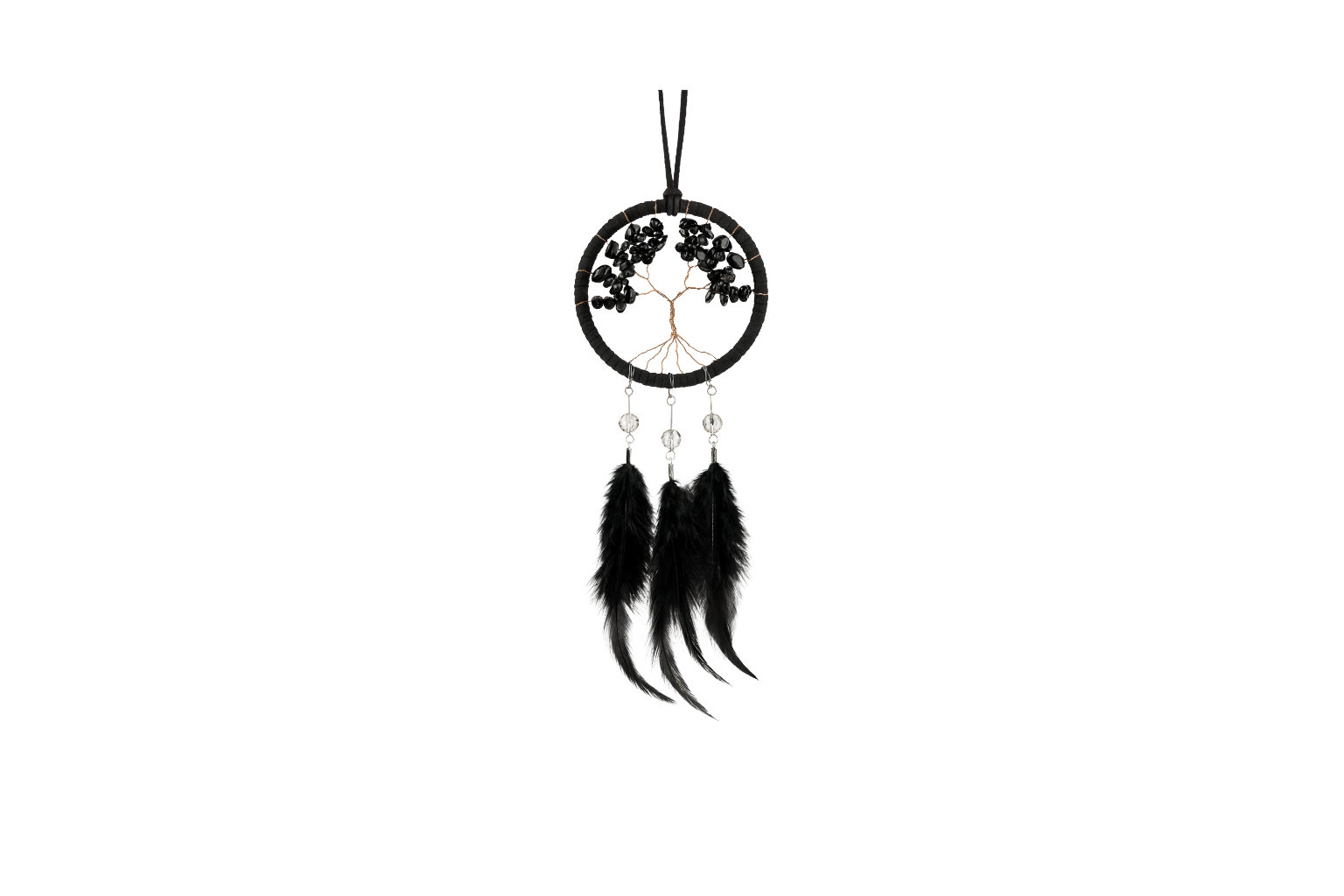 El árbol de la vida simboliza la fuerza, el crecimiento y la conexión entre el cielo y la tierra, recordando que incluso en la oscuridad podemos enraizarnos con firmeza y florecer. Las plumas negras representan protección y sabiduría ancestral, ayudando a disipar miedos y atraer equilibrio emocional.