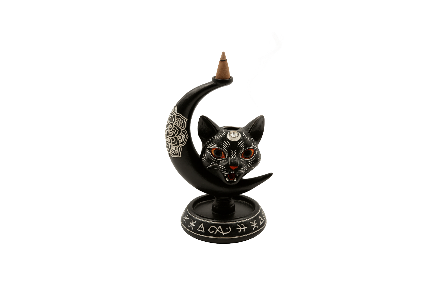 Coloca un cono de incienso en la parte superior y enciéndelo con intención. A medida que el humo asciende y fluye alrededor del gato y la luna, visualiza cómo tu espacio se llena de protección, calma y claridad espiritual. Ideal para rituales de luna, meditaciones, limpiezas energéticas o simplemente para acompañar momentos de introspección y magia personal.
